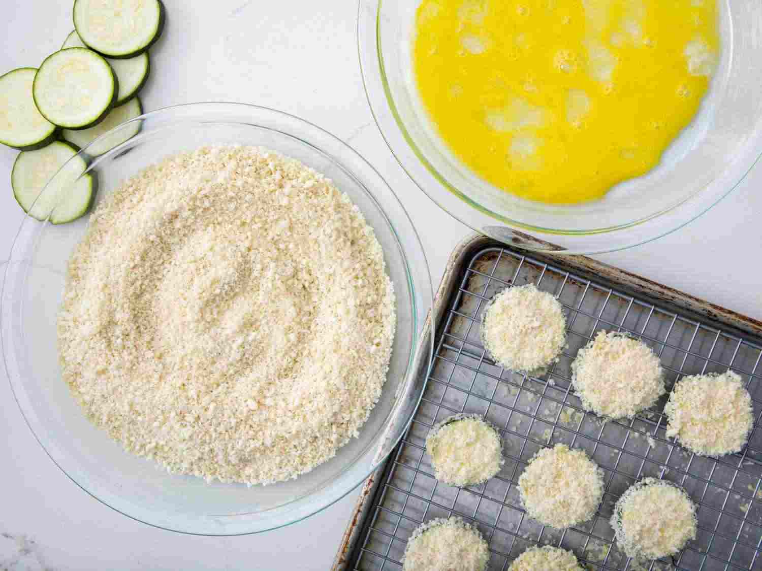 - Step 3:Combine panko and Parmesan cheese on a plate. Dip 1 zucchini slice into beaten egg then into panko mixture, pressing to coat. Place zucchini slice on a wire baking rack and repeat with remaining slices. Lightly spray zucchini slices with cooking spray. Dotdash Meredith Food Studios