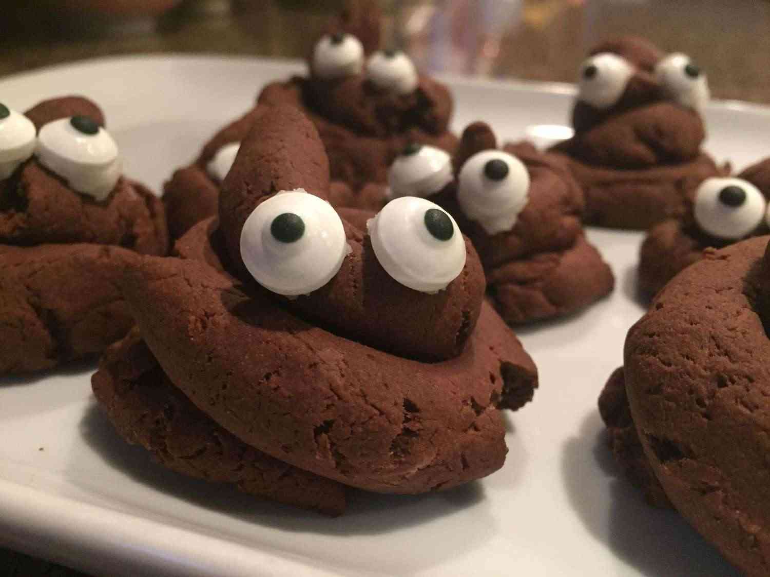 - Step 5:Mix 3 tablespoons confectioners' sugar with lemon juice to form a thin icing. Glue 2 candy eyeballs on each poop cookie and let dry.